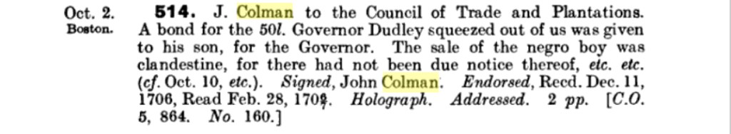Colman writes to London requesting “[a] bond for the 50 [pounds] Governor Dudley squeezed out of us was given to his son, for the Governor. The sale of the negro boy was clandestine, for there had not been due notice there of, etc, etc.” Dudley is dismissive, characterizing Colman’s complaint as a “foolish and groundless aspersion,” further responding “[t]he sale was public and there was another negro sold at the same time at the same price…The Judge never asked 5 p.c. for the condemnations of that prize…as Receiver [Colman was commissioned as Receiver General of Massachusetts] he has, for the most part, himself bought the prizes that have been imported to this place…”