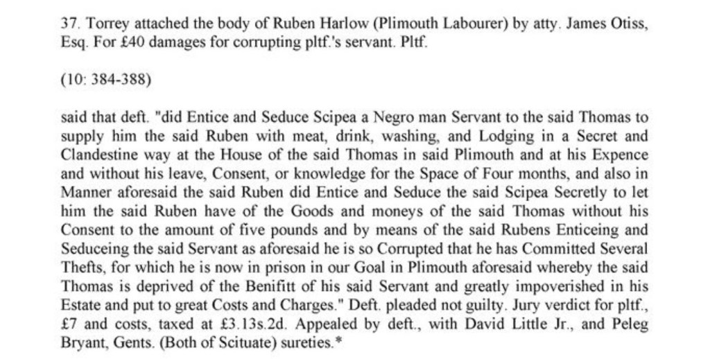 Ruben Harlow “did entice and seduce Scipea a Negro man servant…to supply…Ruben with meat, drink, washing, and lodging in a secret and clandestine way at the house of…[Isaac] Thomas” of Plymouth. And because Harlow “did entice and seduce” Scipea to commit “several thefts” of “goods and money”, Scipea was in jail and Thomas was “deprived of the benefit of his servant and greatly impoverished in his estate”.