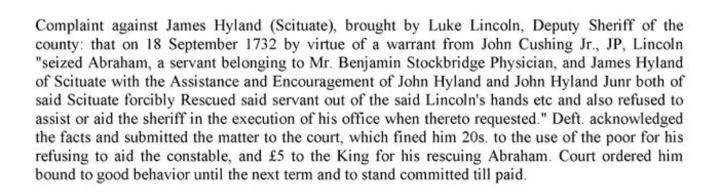 “Lincoln seized Abraham, a servant belonging to Benjamin Stockbridge…and James Hyland…with the assistance and encourgememnt of John Hyland and John Hyland Jr…forcibly rescued [Abraham] out of…Lincoln’s hands…and also refused to assist or aid the sheriff in the execution of his office when…requested”. Hyland “acknowledged the facts” and was fined 20s + £5.