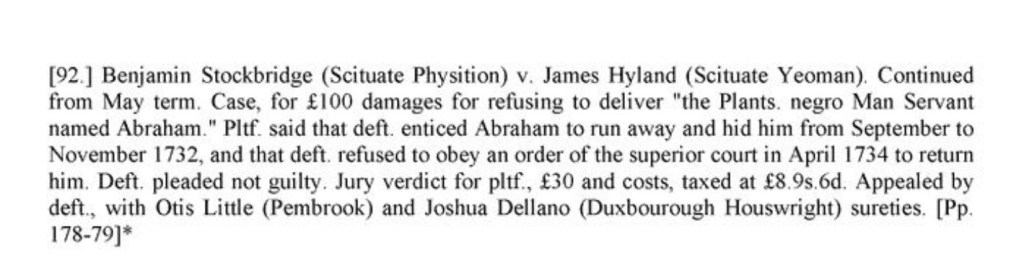 Benjamin Stockbridge claimed that James Hyland “enticed [his negro man servant] Abraham to run away with him and hid him from September to November 1732, and…refused to obey an order of the superior court in April 1734 to return [Abraham]”. Verdict for the plaintiff, appealed by the defendant.