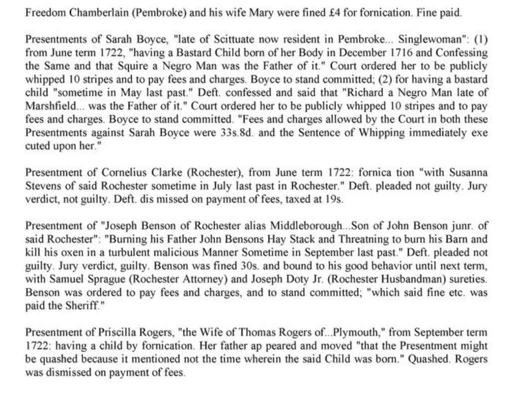 Sarah Boyce of Pembroke, “singlewoman” gave birth to “a bastard child” in 1716 and confessed that “Squire, a negro man, was the father”. The “court ordered her to be publically whipped 10 stripes and to pay fees and charges”. Furthermore, Boyce birthed a bastard child the previous May and confessed, “that Richard, a negro man…of Marshfield…was the father”. Again, the “court ordered her to be publically whipped 10 stripes and to pay fees and charges”, which combined with the previous charges totaled 33s.8d. The sentences of whipping were immediately executed upon her.