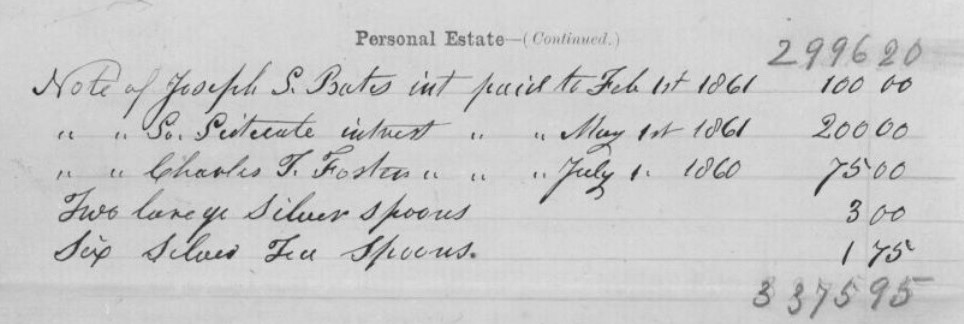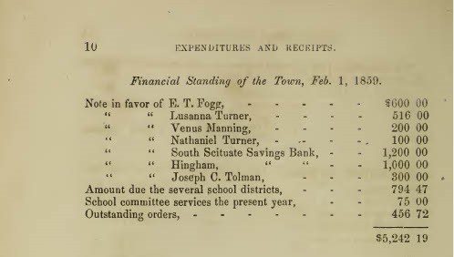 Venus was financially literate. Her probate file further reveals that, upon return to her hometown and presumably after her husband’s death, she held dividend-paying accounts at the Scituate Savings Bank and the South Scituate Savings Bank, and she also owned and collected dividends on three shares in the Boston and Albany Railroad. Beyond that, she held a $200 note against the town of South Scituate. The note against the town is further attested to in South Scituate’s annual report for 1860.