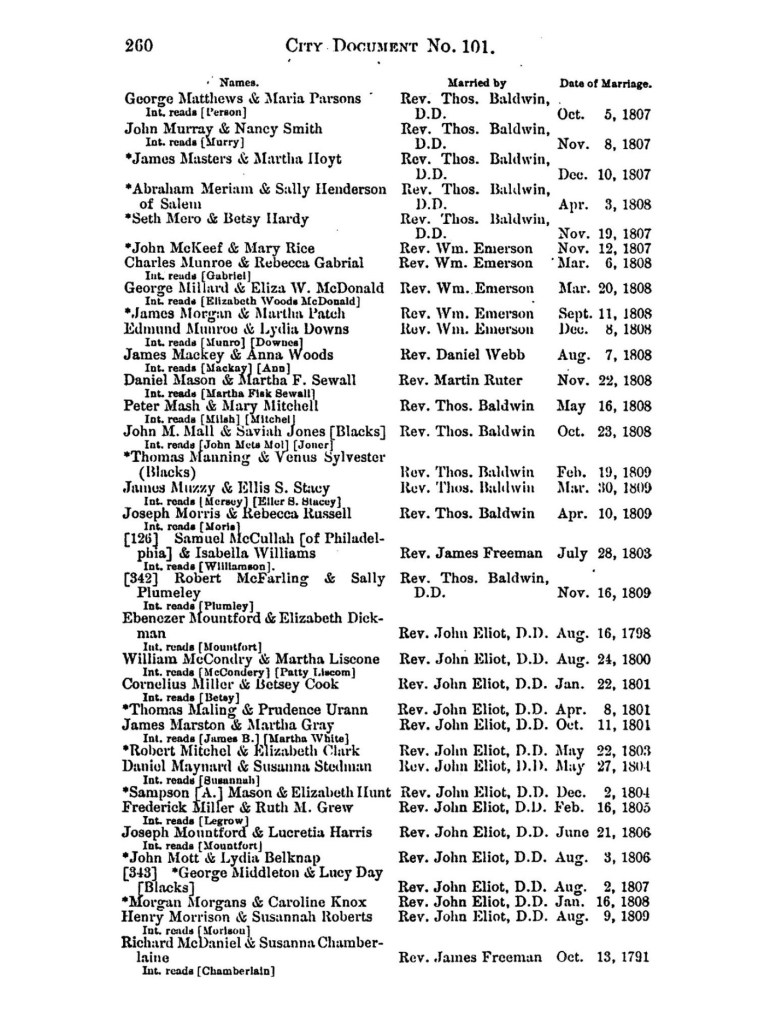 B.) Boston. Registry Department. Report of record commissioners. C.)Original Record of marriages in Boston by Thomas Baldwin, Mss A 1586, R. Stanton Avery Special Collections, New England Historic Genealogical Society, online at DigitalCollection.AmericanAncestors.org.