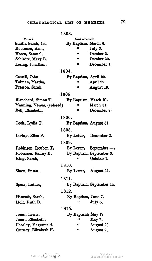 Venus worshipped, married, and banked in Boston. Acknowledging that Venus may have inherited some wealth from her siblings should not discount Venus’s own industriousness. Records from 1805 – 1841 show that Venus was baptized, married, and banked in Boston; she later resided in neighboring Roxbury. Records from Baldwin Place Baptist Church report Venus’s Baptism in 1805. She married Thomas Manning at the same church in 1809. And extant records from the Provident Institution for Savings show both Venus Manning and Thomas Manning making deposits.