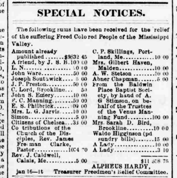 Postscript: In a beautiful postscript to Venus Manning’s life, we find this note in an 1864 issue of The Boston Advertiser. It details a $100 gift from “the Venus Manning Fund” for “the relief of the suffering Freed Colored People of the Mississippi Valley.”