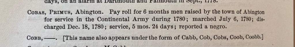 Returning to the bounty list, identifying this document was an out-of-body experience and the question I immediately asked myself was “is Primus Cobus even real?” I could not believe what I was looking at. The Dyer, as luck would have it, is rich with reference material that bears further witness to our man. Primus appears on page 104 of the indispensable Abington and the Revolution as “Primus Cobbus”—note the double ‘b’ as if “Cobbus” derives from “Cobb.” This is also a clue to check alternative spellings in the Dyer’s copies of the magnificent seventeen-volume Massachusetts Soldiers and Sailors of the Revolutionary War where Primus appears under the surnames “Cobus,” “Cobas,” and “Coburn.”