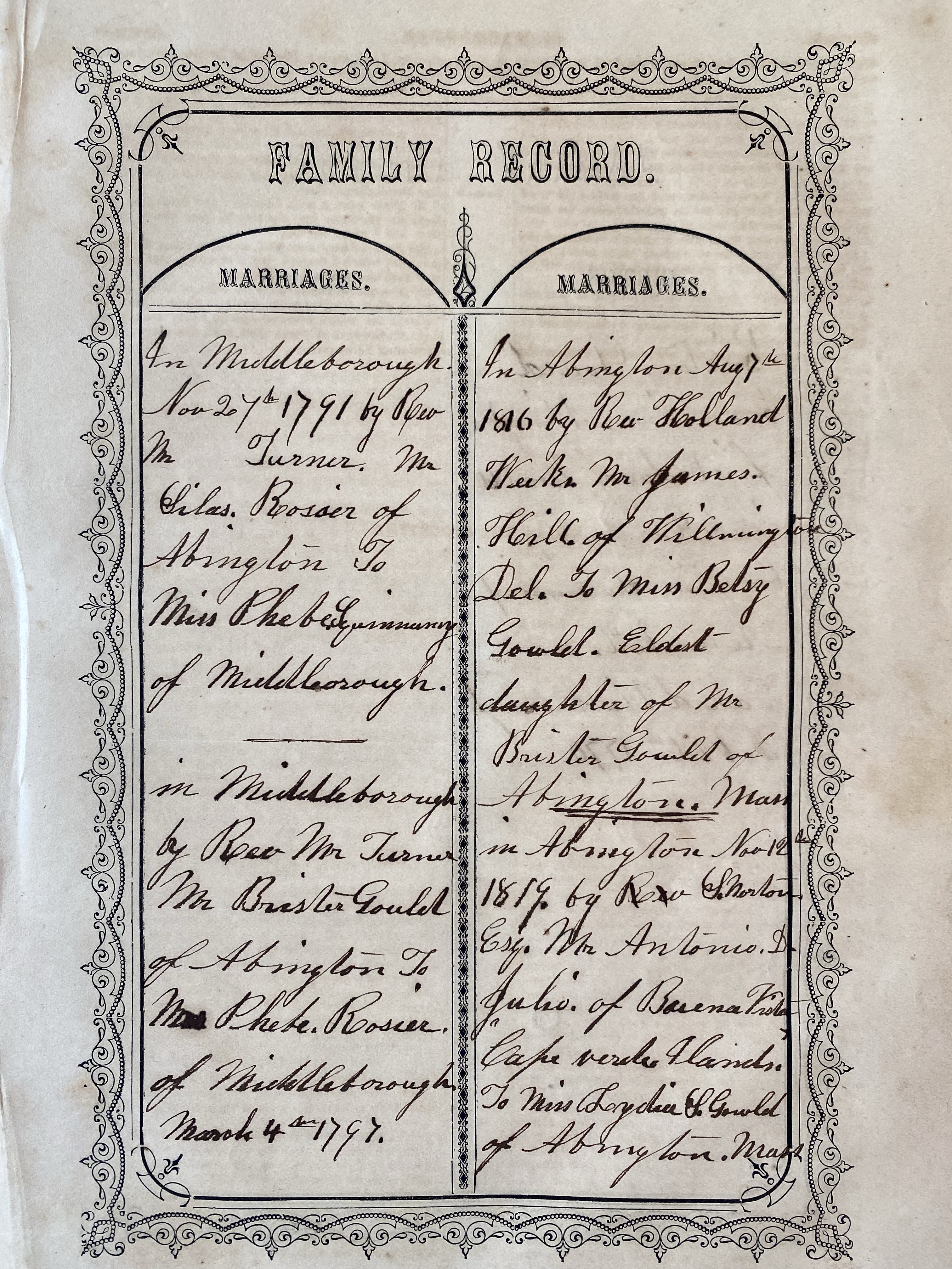 Annotated page from the Vital Records of Abington, Mass. (at DML&A) showing the marriage of Cuffy Rosaria to Dinah Nummuck and the marriage of Phebe Roswell/Rosier, the widow of Cuffy’s son Silas, to fellow Torrey slave and Abington minuteman Brister Gould.