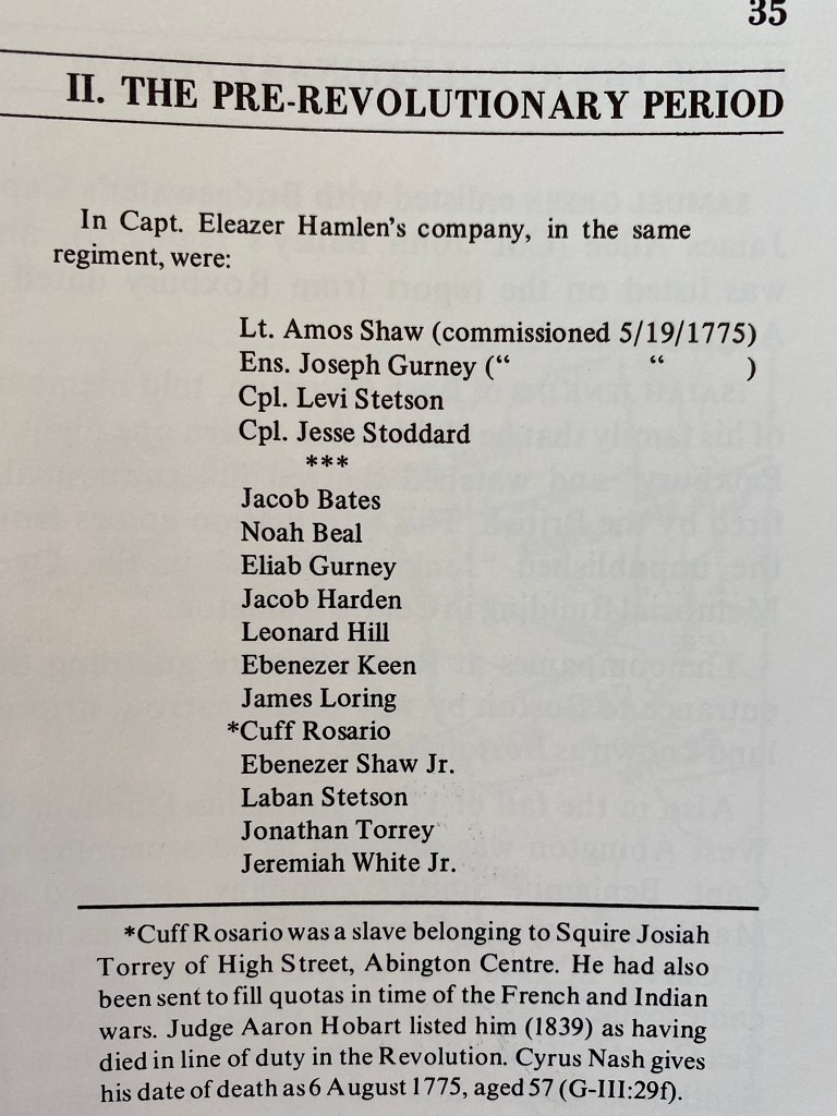 Key words: American Revolution, Massachusetts in the Revolution, Forgotten Patriots, Black Patriots, African American Patriots, Slavery in Abington, Massachusetts, Slavery in Plymouth County, Slavery on the South Shore, South Shore Slavery, General John Thomas, Roxbury, Massachusetts, Slavery in Roxbury, slaves, enslaved, slave, Cuff Rosier, Cuff Rosaria, Cuff Roserea, Cuff Rocery, Cuff Rosary, Cuff Rozery, Cuff Rosercy, Cuff Roserey, Cuff Roso, Silas Roso, Silas Rosary, Silas Rosercy, Silas Rositer, Silas Rozery, Dinah Lamb, Dinah Nummuck, Nummock, Wampanoag, Indians in the Revolution, Native Americans in the Revolution, Indians in Abington, Native Americans in Abington, runaway slave ad, Squire Torrey, Roxbury in the Revolution, Numucke