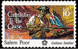 Salem Poor was famously commemorated by a stamp issued by the U.S. Postal Service for the bicentennial. Long celebrated, this once enslaved man performed heroically at Charlestown while assisting the wounded and he may have fired a final volley that killed British Lt. Col. James Abercrombie. Poor’s superior officers submitted a petition to the Massachusetts legislature lauding his outstanding battlefield courage.
