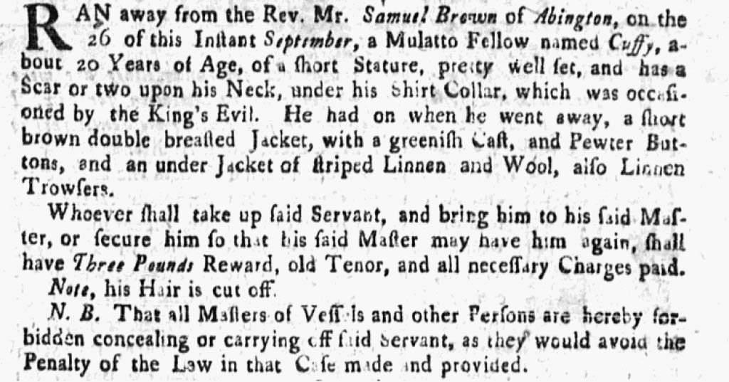 28 years before the Battles of Lexington and Concord, we find a 1747 ad in the Boston Evening-Post documenting Cuffy’s earliest known act of resistance: “Ran away from the Rev. Mr. Samuel Brown of Abington…a Mulatto Fellow named Cuffy.”