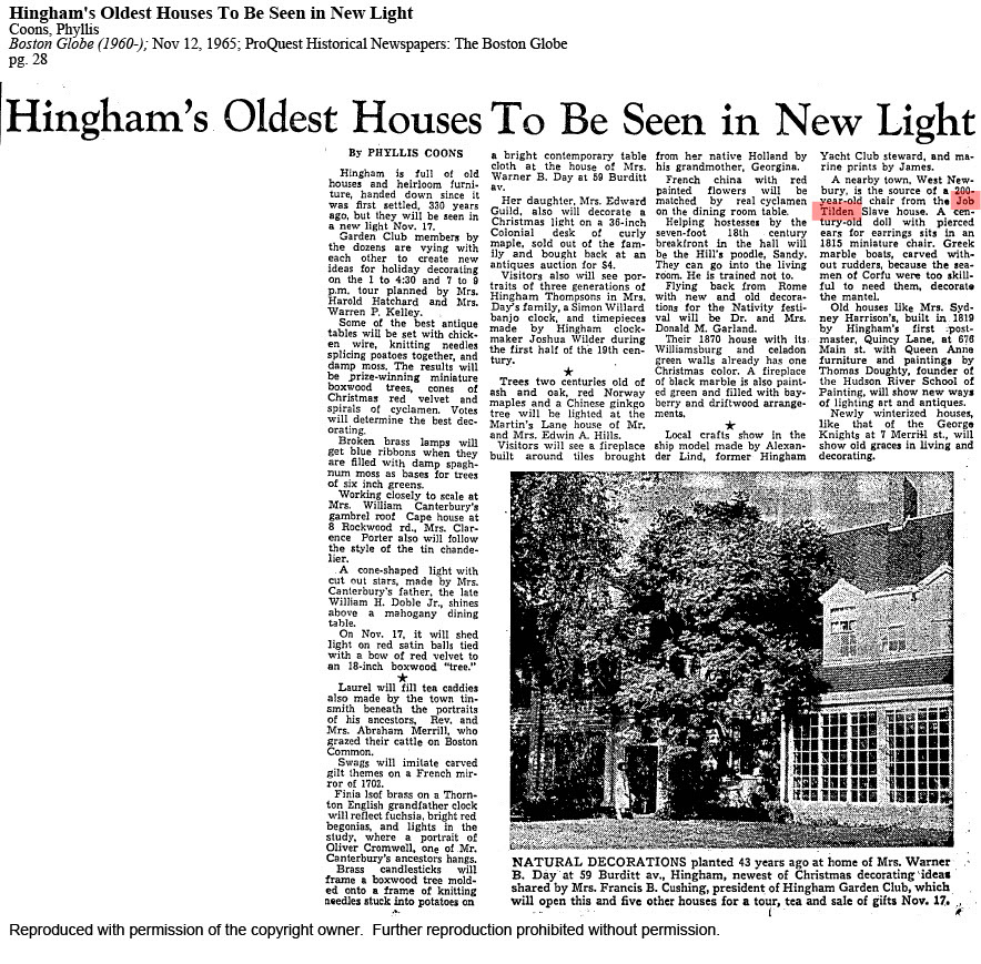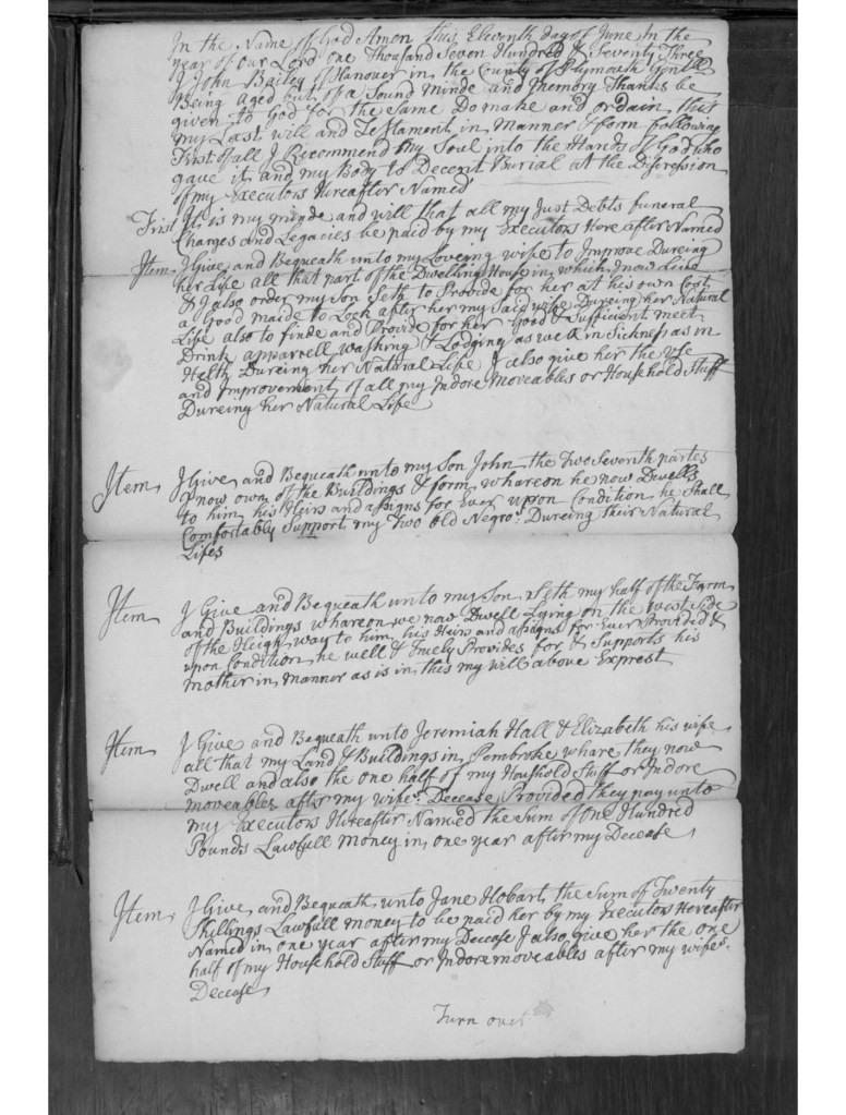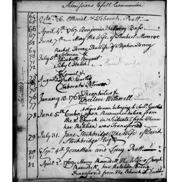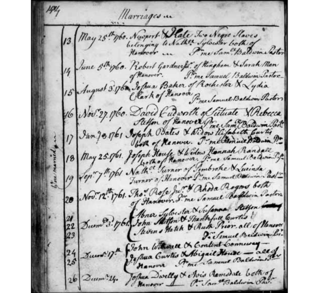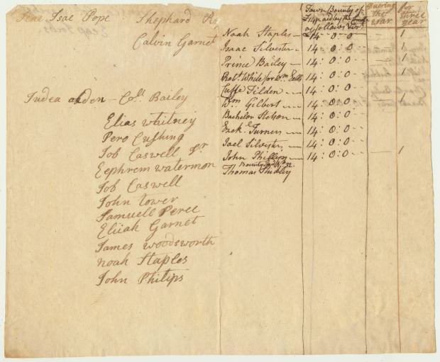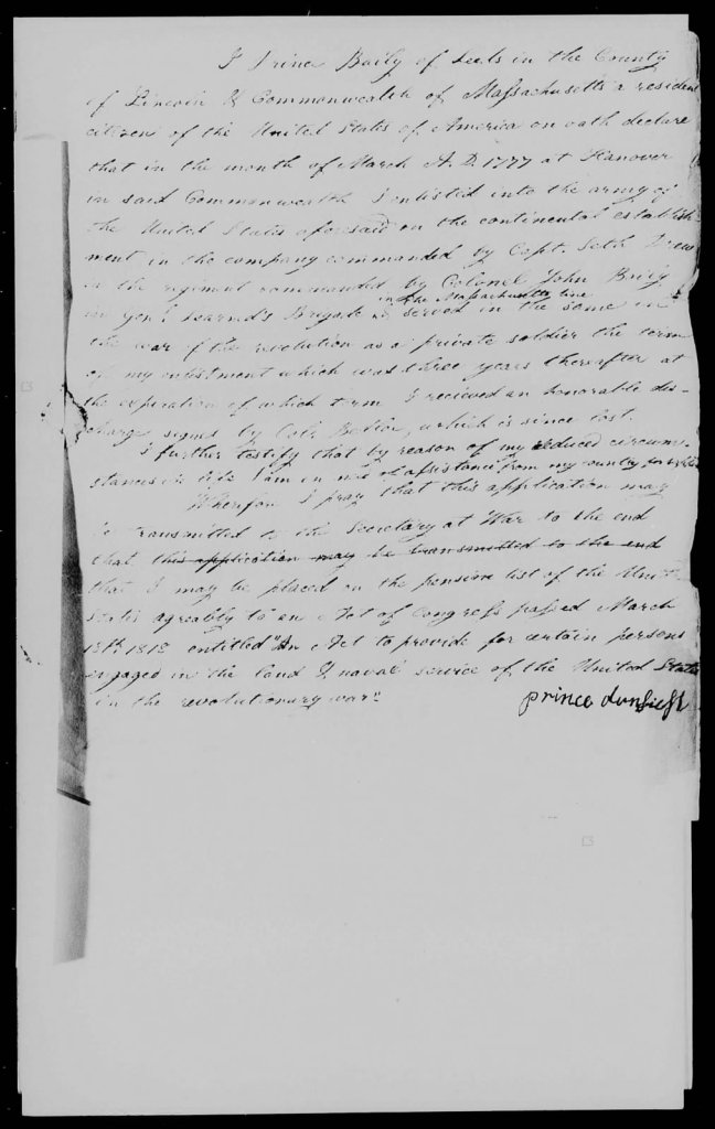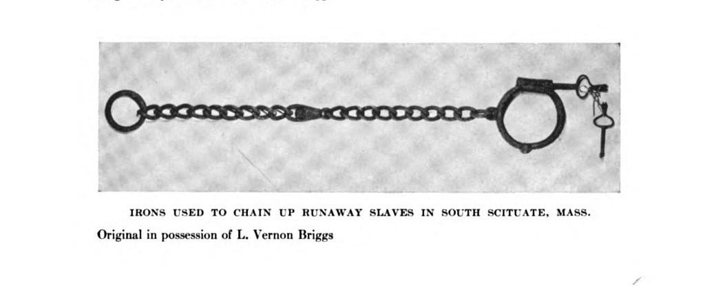 Bounty list of Massachusetts 2nd Regiment featuring the names of two enslaved Revolutionary soldiers: Prince Bailey and Cuffe TildenMuster Roll for Massachusetts 2nd Regiment listing Prince Bailey on 27 March 1777.US Census, 1790 showing Prince Dunsick/Prine Duncat in Littleborough Plantation, MEUS Census, 1800 showing Prince Dunsick in Leeds, MEUS Census, 1810 showing Prince Dunsick in Leeds, MEUS Census, 1830 showing Prince Dunsick in Greene, MEPrince Bailey lived at George Bailey’s property (512 King St)Prince Bailey pension app excerpt.“Titus my Negro Boy”. Rev. Samuel Bass records the 1742 baptism of the man he enslaved. “Newport & Kate, the Negro Slaves belonging to Nathn’l Sylvester both of Hanover” recorded by Rev. Samuel Baldwin.June 5 1768: “Cuba, a negro woman, belonging to Sam’l Curtis upon recommendation from the 2d Church in Scituate from whence her relation was transferred” and is given admission to full communion.Capt. John Bailey, 1773: “I give and bequeath unto my on John the two sevenths part of the buildings and farm whereon he now dwells…upon condition that he he shall comfortably support my two old negroes during their natural life.”Joseph Barstow’s 1728 probate inventory: “1 bond for a negro woman; 1 negro woman named Rose”.Matthew Estes 1774 will: “I will and bequeath to my daughter Sarah Sylvester after her mother hath done with it, all my livestock out of doors, and all of my house hold goods within doors with the negros.”1787 Joseph Josselyn will: “I give to my said wife the service of my negro man Cuffe covering her natural life”. Slavery was abolished in Massachusetts in 1783.Excerpt from Dwelley and Simmons HistoryExcerpt from Dwelley and Simmons HistoryExcerpt from Dwelley and Simmons HistoryWho is in possession of this chain today? From Briggs, L. Vernon (Lloyd Vernon). (1938). History and genealogy of the Briggs family, 1254-1937 Vol. 1 (after p. 122)Silver communion beaker gifted by slaveholder Dea. Joseph Stockbridge to the first church in 1768, now residing in the MFA Boston. A sibling beaker resides at NYC’s Metropolitan Museum of Art.