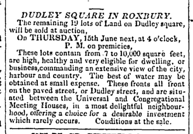 The earliest reference I can find to Dudley Square is an 1826 real estate ad for property in Dudley Square “between the Universal and Congregational Meeting Houses” which is describing the property currently between[MAP] the First Church/Putnam St and Guild Row/Nubian Station.
