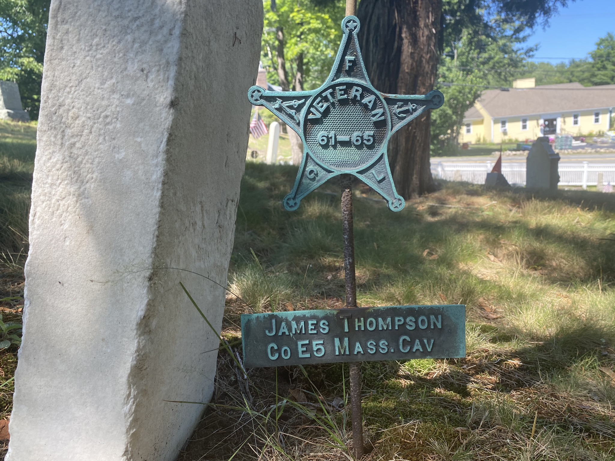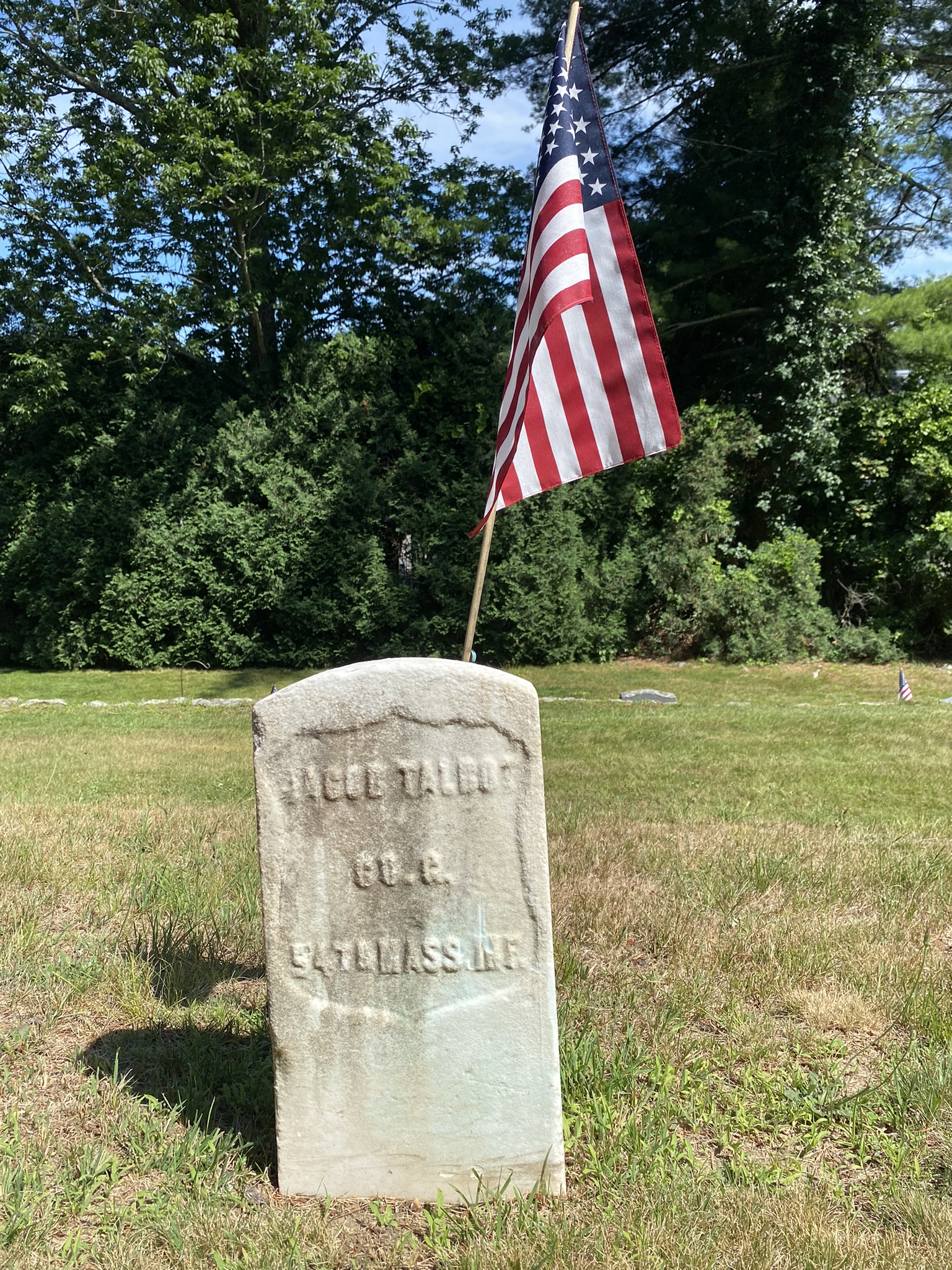 Enter Norwell’s First Parish Cemetery by foot from Main Street, turn left and walk parallel to the fence for 75 yards. To your right, nestled amongst a sloping grassy landscape featuring the shade of pine trees, you will find a cluster of 13 Civil War veterans’ gravesites. Eight of these men were African American. Not all men fought in Robert Gould Shaw’s 54th like William Freeman, Jacob Talbot, and Henry Winslow. Lemuel Freeman and Albert Winslow, of course, served in white regiments. John Talbot served in the 55th Mass. Infantry, the regiment created to accommodate the enthusiastic nationwide surplus of men who wanted to join the 54th. Two others, James Patterson and James Thompson, fought in the 5th Mass. Calvary, the third and final USCT regiment formed in Massachusetts.