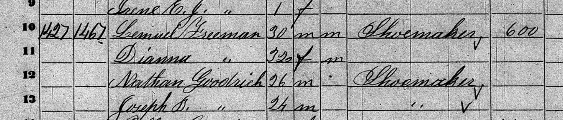 Thirza Freeman raised her son Lemuel, but she never married. Lemuel wedded his cousin Diana Comsett Freeman in 1849; Diana gave birth and lost a daughter months before the marriage. And in the following year’s U.S. Census, we find Lemuel’s mother in the South Scituate almshouse described as a “pauper;” Thirza died there indigent ten years later, just before the war.