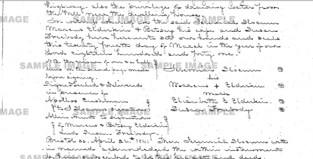 - For the 1842 document dividing the land of the deceased Primus Slocum between his heirs Jeremiah Slocum, Elizabeth/Betsey (Slocum) Elderkin, and Susan (Slocum) Freebody, see Northern Bristol County Registry of Deeds: Page 1. Page 2. Page 3.
