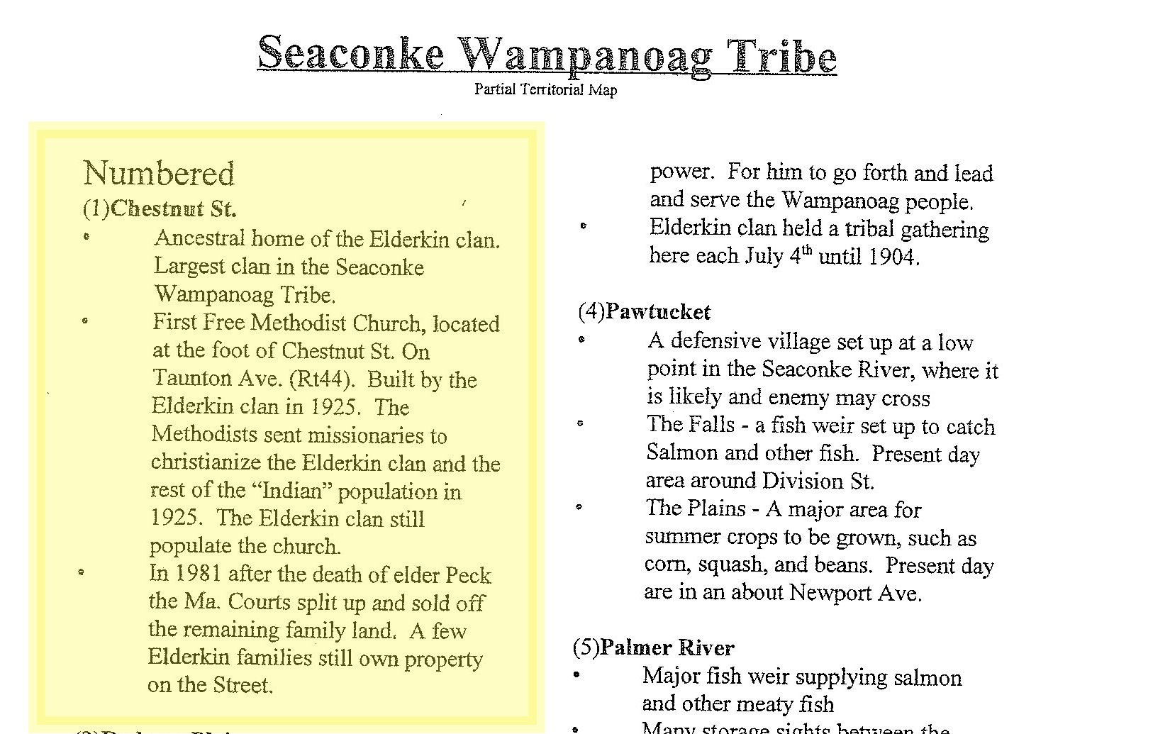 - Merkley, M. (1999, August 22). (1)Chestnut St. The Seaconke Wampanoag Tribal History. see .pdf #33.