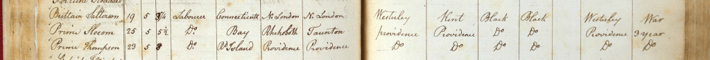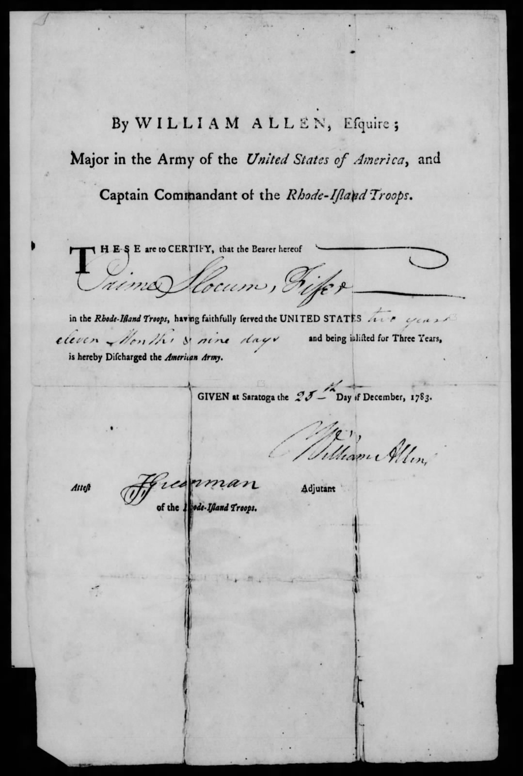 - Revolutionary War Pension and Bounty Land Warrant Application File S. 39844, for Primus Slocum, Rhode Island. National Archives and Records Administration.
