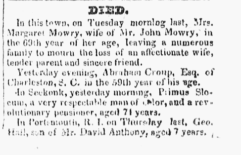 Primus died in Seekonk in 1836 and was cared for enough by family and community to rate a death notice mentioning his Revolutionary War service.1,8,27,28 The notice appeared in papers from Boston to Providence and to New York City.