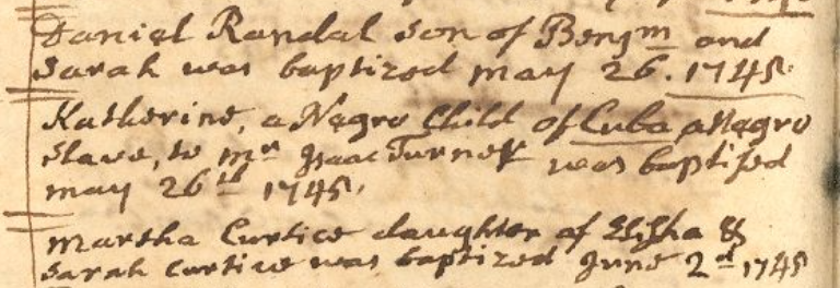 Further compelling, in 1745, we find in Norwell church records that an enslaved woman named Cuba baptized three children: Richard, Thomas, and Katherine. Katherine’s age is unclear, and given that Cuba gained admission to the church a few months previous in 1744, Katherine may have been anywhere from toddler-age to nine(-ish) years old. And if Cuba baptized Katherine as young as age 3, she would have been 18 at the 1760 Hanover marriage of Newport and Kate and aged 20 at the 1762 birth of Catherine Sylvester.